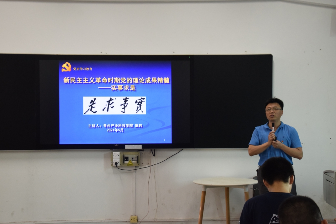 课程伊始,宋美娴介绍了开展本次党课的目的与意义,她强调认真学习党史,是适应时代发展的需要,更是新时代坚持党的全面领导的必然要求。随后,陈伟以新民主主义革命时期党的理论成果精髓——实事求是为主题,紧紧围绕“实事求是思想路线的形成和确立”、“实事求是思想路线的重新确立和发展”、“‘两个凡是’和真理标准大讨论”三部分分别阐述了对“实事求是”思想路线的理解。他表示要牢记习近平总书记的嘱托,重视历史,研究历史,借鉴历史,与历史同步伐,与时代共命运。