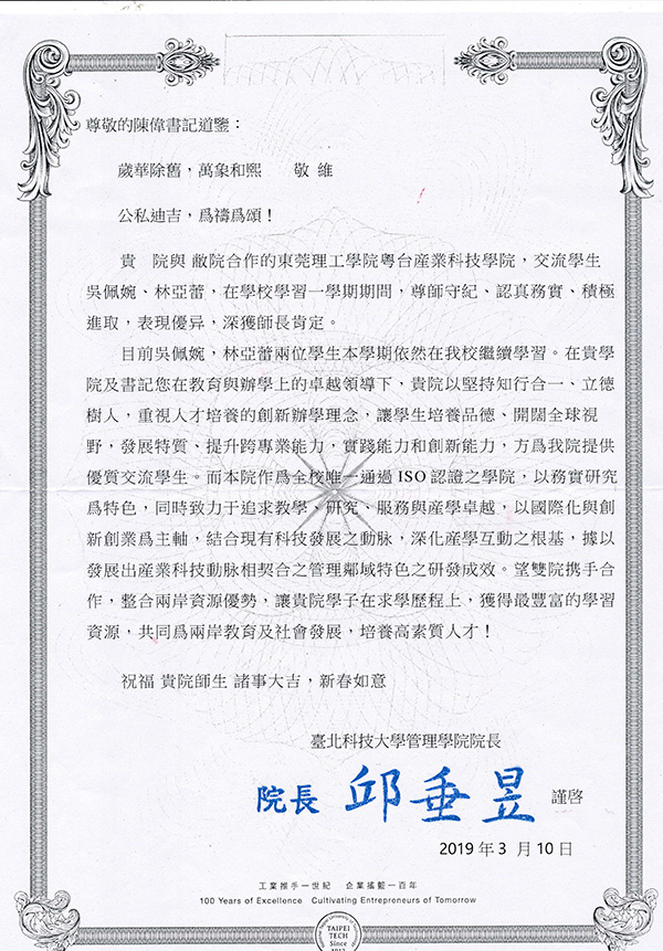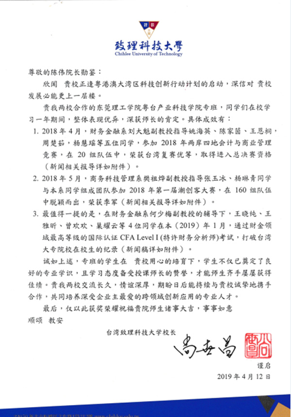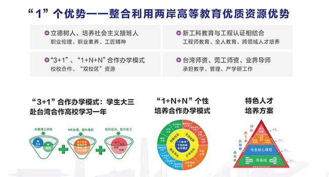 建设两岸高校合作办学的标杆William威廉英国官网是williamhill威廉官网与东莞台商育苗教育基金会、台湾合作高校共同举办的广东省首个两岸高等教育合作办学公司,是williamhill威廉官网高水平理工科大学建设中重点建设的现代产业公司之一。公司整合与利用两岸高等教育优质资源,凸显应用型人才培养和社会化服务特色,立足东莞市,面向广东省和粤港澳大湾区产业发展需求设置专业,实现两岸高校优势专业与学科的强强联合,引入台湾教学管理模式,全职引进台湾团队团队承担教学、管理工作,培养适应现代产业发展需求,勇于担当、善于学习、敢于超越的跨专业高素质应用型创新人才。