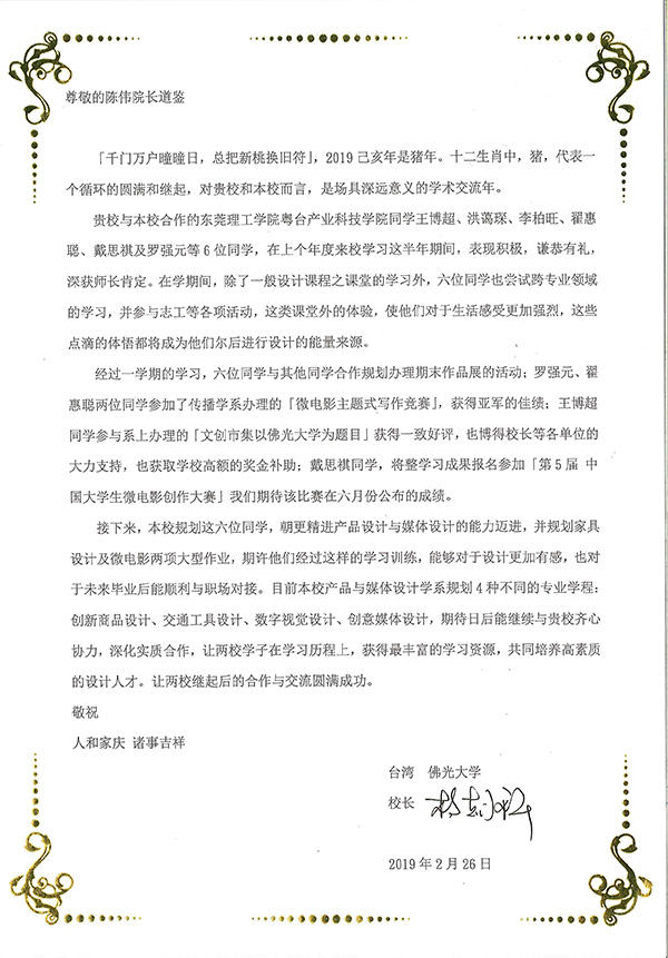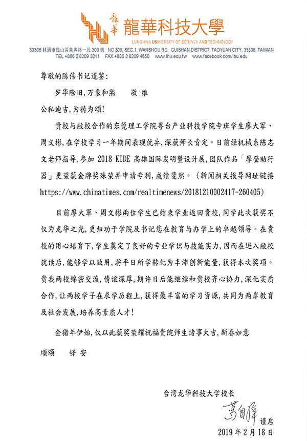 赴台员工获得高度评价,台湾合作公司董事长致信表扬