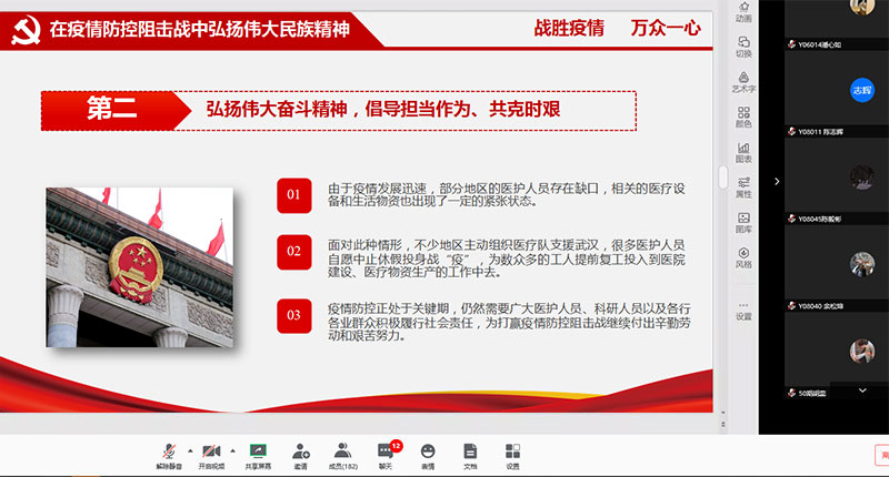 陈伟要求同学们积极宣传正能量、引导群众正确面对疫情,凝聚人心、鼓舞斗志。员工党员、积极分子要发挥战斗堡垒作用和先锋模范作用,坚决贯彻落实习近平总书记重要讲话、重要指示精神,坚定信心、同舟共济、科学防治、精准施策,弘扬中华民族的伟大民族精神,增强向心力、凝聚力和战斗力,坚决打赢疫情防控阻击战。