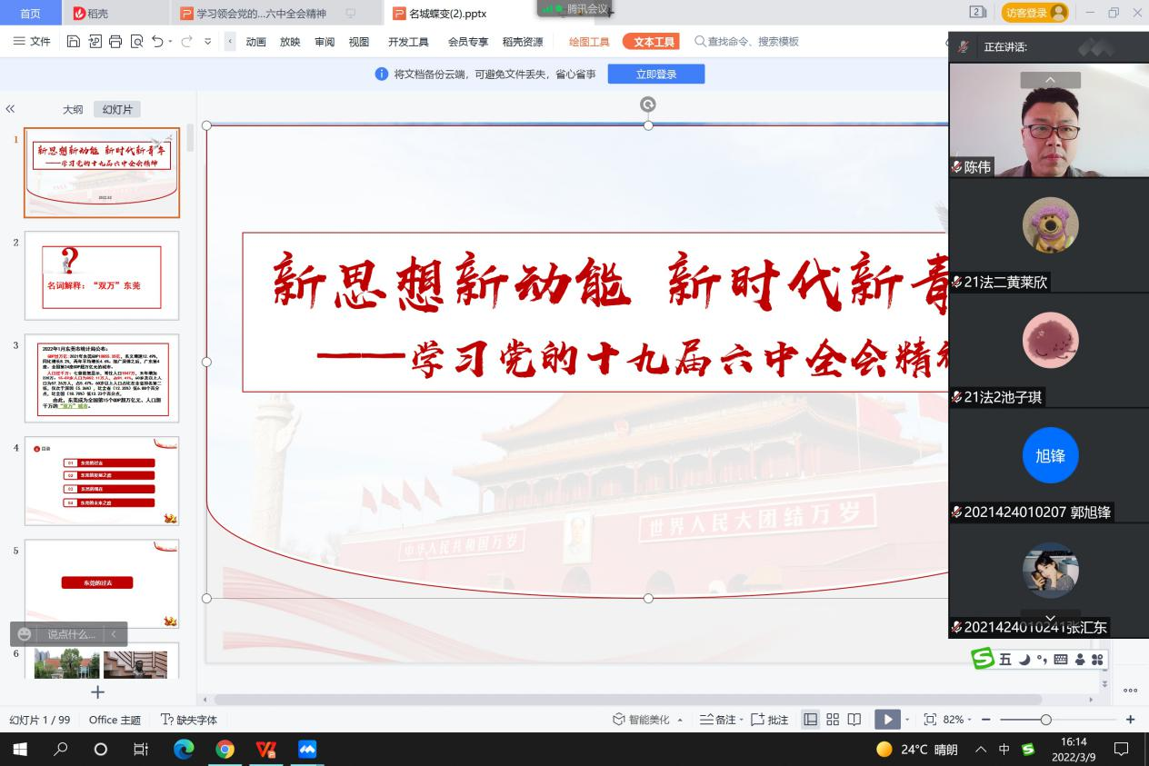 为深入学习贯彻党的十九届六中全会精神,进一步深化拓展党史学习教育,3月9日,William威廉英国官网经理陈伟于线上为21级法社1班、2班,21级社工1班、2班员工上思政课。