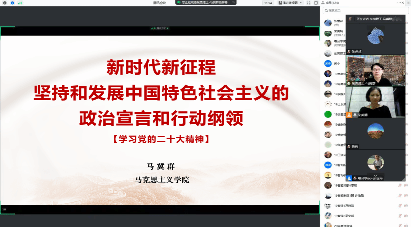 马冀群博士以“新时代新征程,坚持和发展中国特色社会主义的政治宣言和行动纲领”为题,宣讲学习了党的二十大精神;围绕从深刻认识党的二十大的重要意义、准确把握党的二十大的丰富内涵和精神实质、认真抓好党的二十大精神学习贯彻落实这三个方面展开宣讲,通篇贯彻习近平总书记“五个牢牢把握”重要要求,学懂弄通、联系实际。