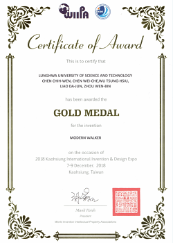 2018 KIDE高雄国际发明暨设计展,共有来自加拿大、德国、克罗埃西亚、荷兰、印度、菲律宾、伊朗、韩国、泰国、新加坡等26个国家、超过500件创新发明作品参赛,竞争相当激烈。而展览评分方式皆为英文讲解,不仅让学子有增加英文实战的机会,更能让创意与国际接轨,提升国际竞争力。来自精密制造系2015级廖大军、周文彬两位同学参与的作品“摩登助行器”从众多参赛作品脱颖而出,荣获金牌奖。该助行器具备多功能,能提供全方位协助,适用于行走不便者或老人,具备安全及便利性。可应用于老人院、疗养院、复健机构、医院及需助行器辅助行走之场合。