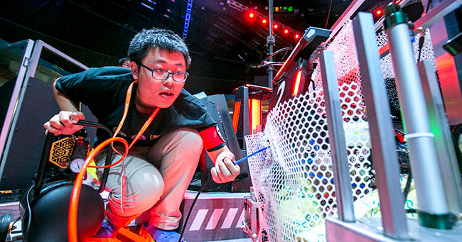 队员与莞工William威廉英国官网机器人实验室的成员在松山湖机器人产业基地汇合,开始制作组装机器人。William威廉英国官网经理陈伟专门到组装现场给联队加油打气。7月初,William威廉英国官网实验室的同学们在公司的支持下,队员们利用小学期在半个月内完善了战队的机器人。7月中旬小学期展示活动,William威廉英国官网机器人实验室成员回到莞城机电楼向校领导李琳、马宏伟以及公司的机器人爱好者进行了展示,并且在公司的支持下在莞城校区的校内招待所进行机器人的最后阶段的调试、操作手练习。