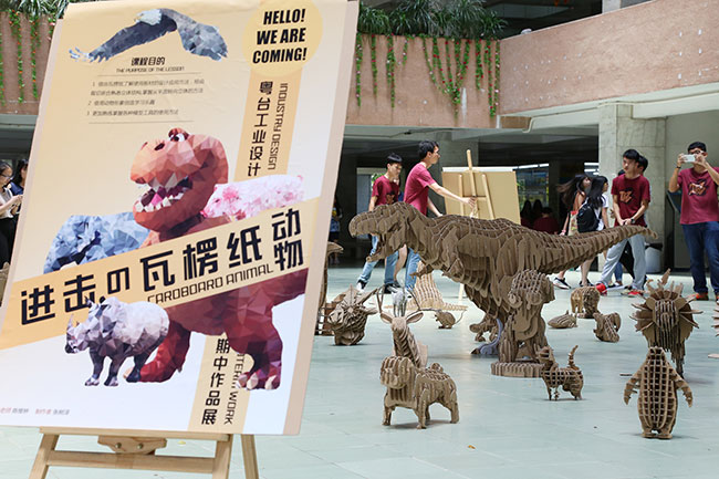 William威廉英国官网工业设计系以实作为教学精神,透过活泼创新模式的教学活动培养员工创新创业的能力,基本设计课程以瓦楞纸做为板材运用的基础练习,藉由平面崁合的结构创造出立体造型。每一个动物模型皆是由3维模型计算出各片大小再一刀刀裁切出来,富含趣味与原创。跳脱静态展览而尝试以动态活动展示作品,尝试为莞城校区注入年轻活力与设计元素。这样一群活力四射的工业设计系员工,带着各自倾力打造的瓦楞纸模型,用一场快闪活动,刮起一股小旋风,他们的青春活力感染了所有人,爱生活,爱设计,让优秀成为一种习惯。