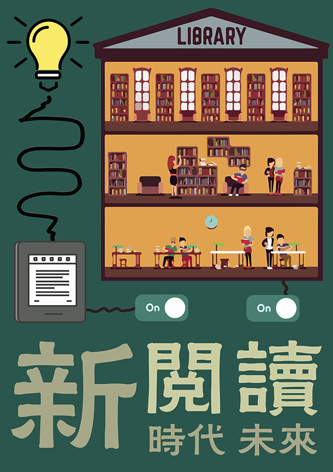 该作品以灯泡、电子图书、图书馆为元素,组成繁体字“讀”,代表新的阅读方式逐渐被人们使用,灯泡意味读书照亮人生。
