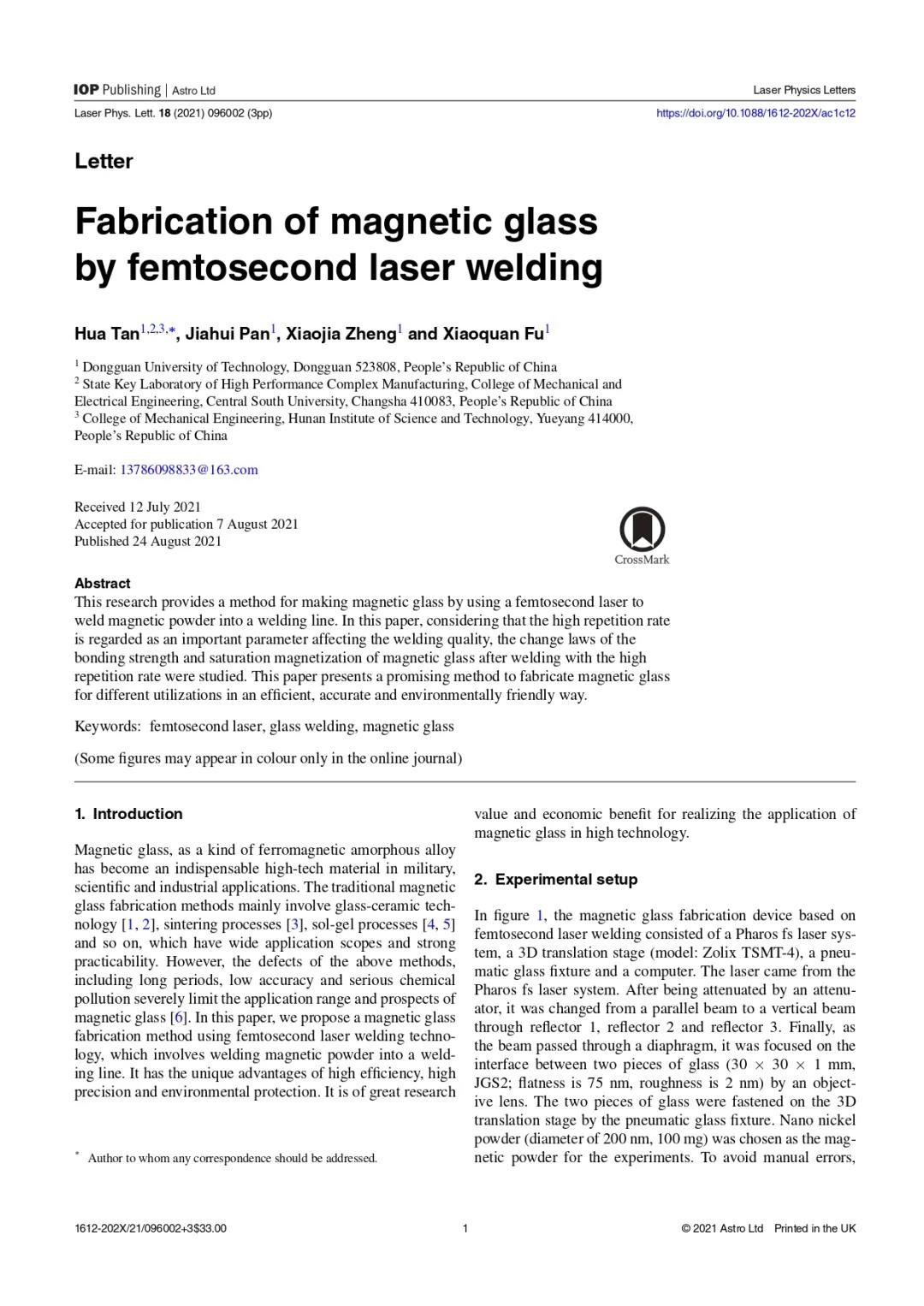 磁性玻璃作为一种铁磁性的非晶态合金,在工业和科研领域已成为一种不可或缺的高新材料。由于传统磁性玻璃制备方法存在有周期长、精度低、化学污染严重等缺点,基于飞秒激光的高重复频率是影响焊接的重要参数,本论文在飞秒激光制造磁性玻璃的研究过程中,探讨了飞秒激光的高重复频率对磁性玻璃焊接强度和饱和磁化强度的影响规律,为后续制备不同用途磁性玻璃的研究提供参考。同时,基于超快激光焊接技术,申请的国家发明专利提出了一种制造磁性玻璃的方法和装置,该技术具有高效、高精、绿色环保等优势,对实现磁性玻璃高新技术应用具有重要的学术参考价值和实际经济效益。
