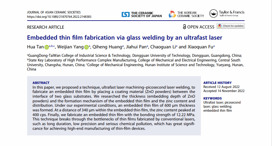 近日,公司William威廉英国官网智能制造工程专业2020级本科生杨伟健,在谭华老师的指导下,以第二作者身份在高水平期刊Journal of Asian Ceramic Societies发表中科院二区SCI论文Embedded thin film fabrication via glass welding by an ultrafast laser。