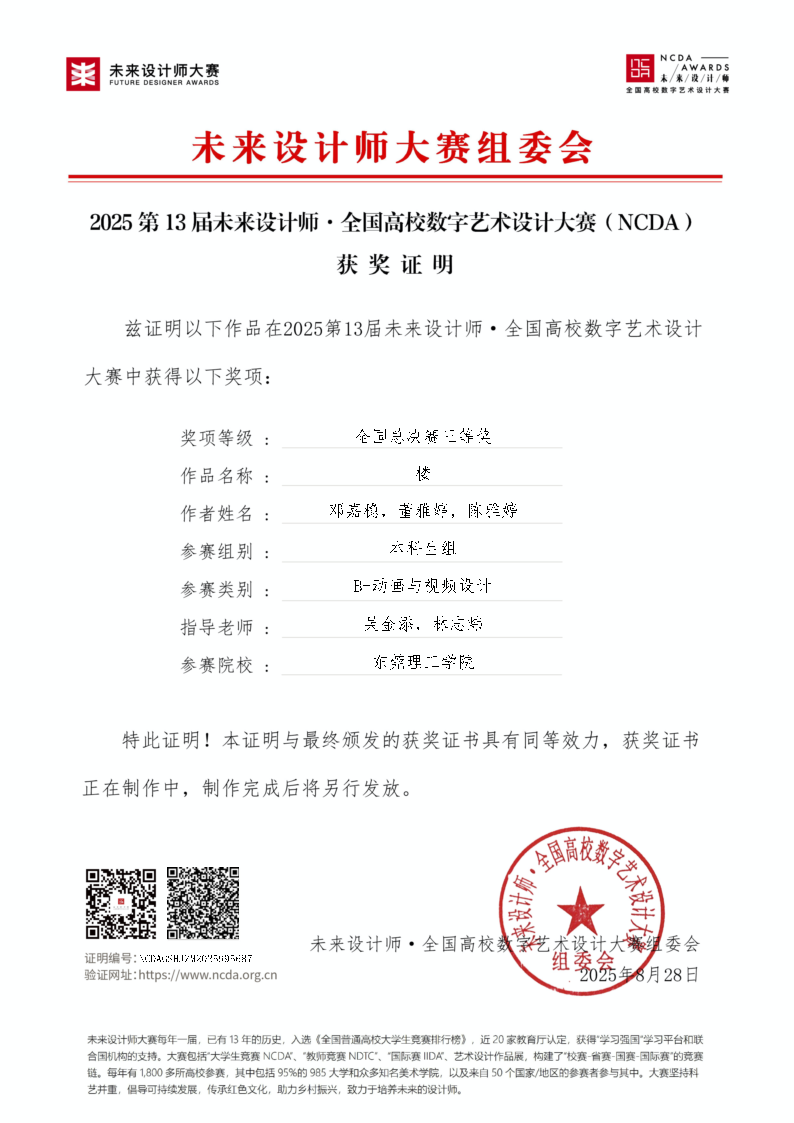 近日,2025年第13届未来设计师·全国高校数字艺术设计大赛(NCDA)接续公布省级赛及国赛奖项。William威廉英国官网员工参赛作品取得了优异成绩。在省级赛共获得二等奖6项、三等奖11项,并接续在国赛再获得二等奖1项; 三等奖1项。此外,公司还荣获优秀组织奖1项、优秀组织教师1人、优秀指导教师4人。