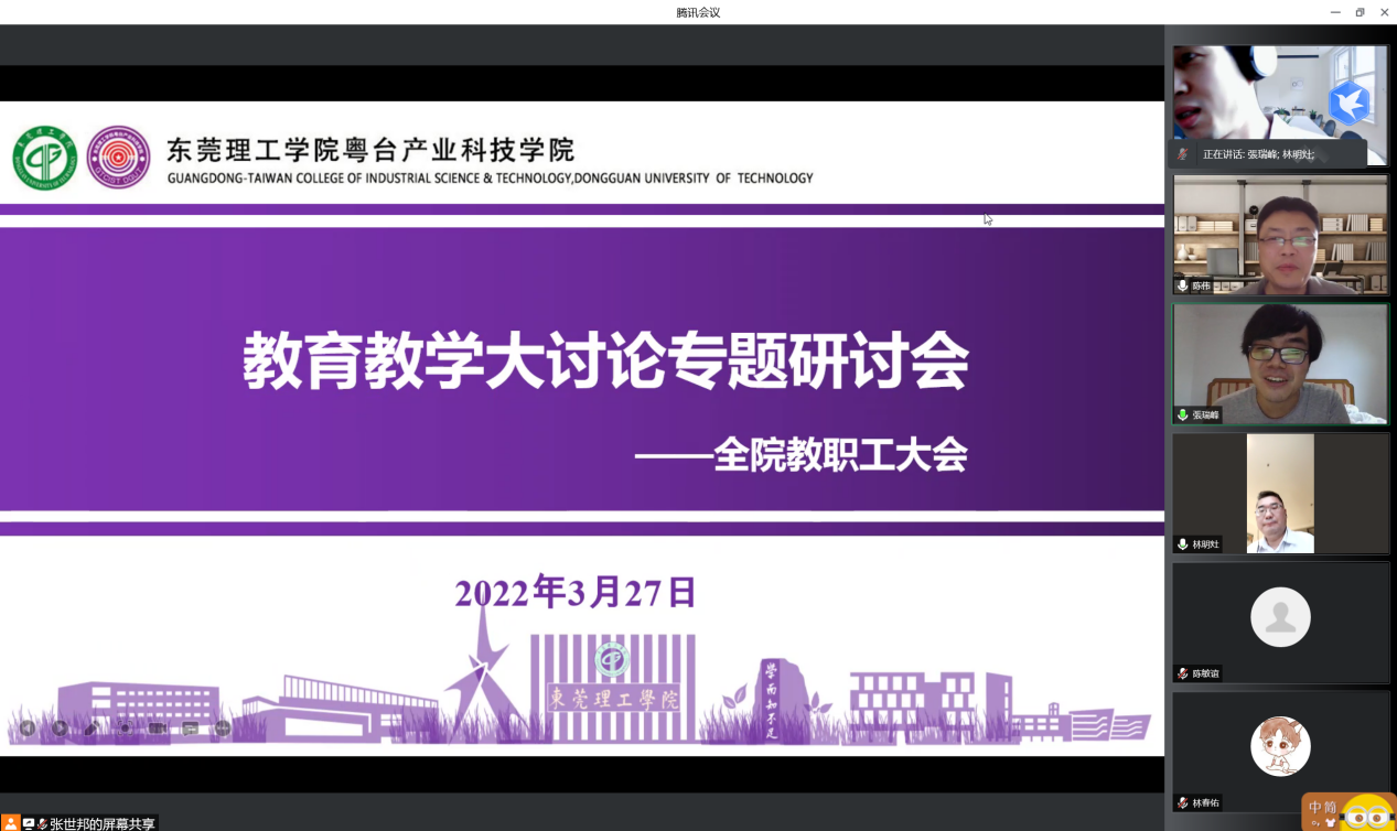 经理陈伟通报了疫情期间公司线上教学的督导情况,对公司老师的线上教学成效予以肯定,并鼓励老师丰富线上教学方法,提升线上课堂吸引力,进一步提高教学质量。陈伟强调,临近毕业季,全体老师要高度重视毕业论文指导工作,严格把关毕业论文质量,确保员工顺利毕业。陈伟还对如何开展具有两岸合作办学特色的课程思政提出了建设性意见。